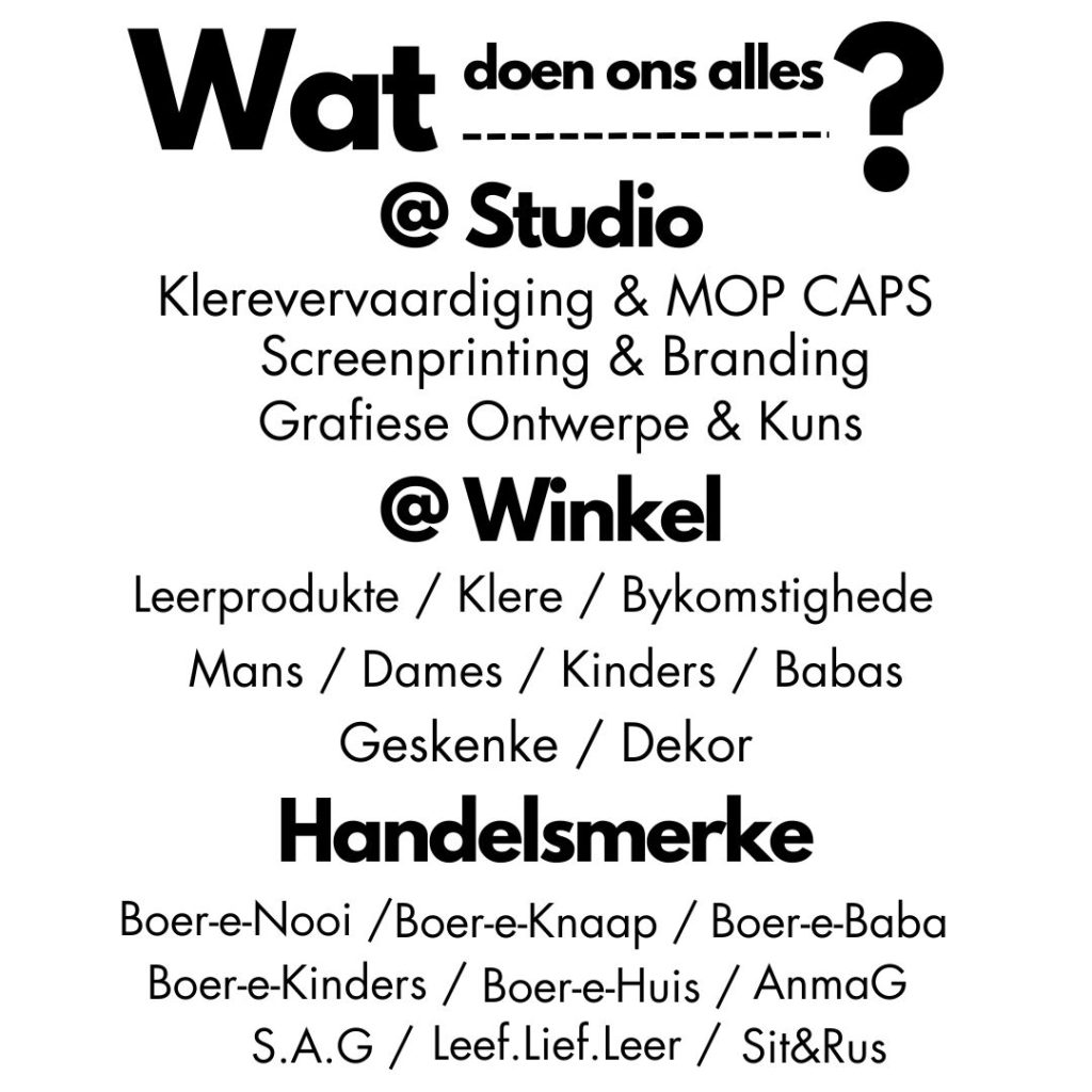 Boer-e-Nooi Ontwerp Studio is ’n Klerevervaardigingsmaatskappy.